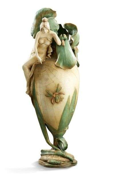 Vase "Iris" en faïence émaillée polychrome figurant une femme et un iris en relief sur fond d'une toile d'araignée.