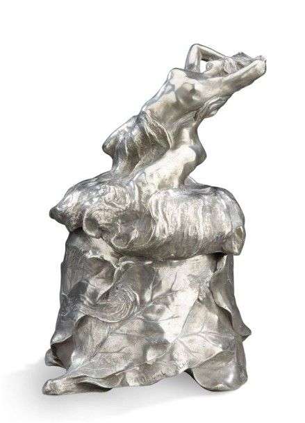 Pot couvert en étain à décor en relief d'une naïade et de motifs floraux.