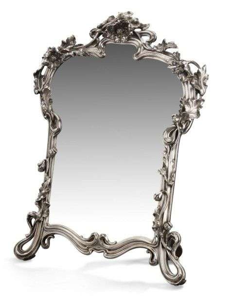 Rare miroir en étain argenté à encadrement mouvementé à motifs floraux.