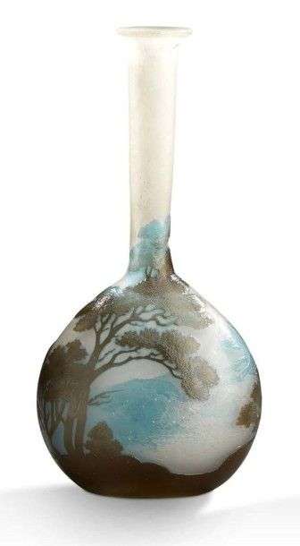 Vase soliflore en verre multicouche à décor dégagé à l'acide d'un paysage montagneux bleu et brun sur fond opaque.