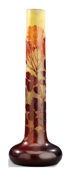 Vase soliflore à long col droit et base aplatie en verre doublé à décor dégagé à l'acide de motifs floraux orange et bruns sur fond opaque jaune.