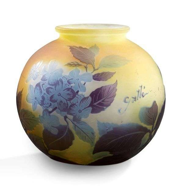 Vase boule en verre multicouche à décor dégagé à l'acide de motifs floraux mauve nuancé bleu sur fond opaque jaune.