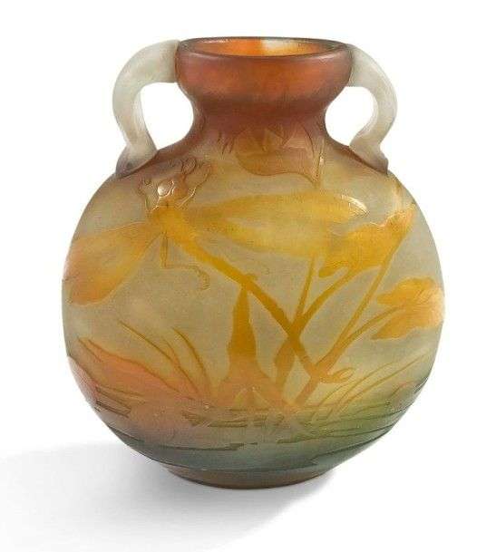 Vase gourde à anses en applicatiion à chaud en verre multicouche à décor dégagé à l'acide d'une libellule en vol dans les marais dans les tons orange nuancé sur fond opaque.
