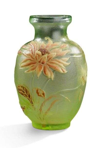 Vase de forme balustre en verre teinté vert à décor dégagé à l'acide et émaillé polychrome de dahlias.