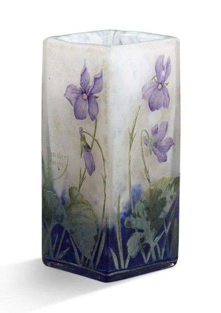 Vase quadrangulaire en verre doublé à décor dégagé à l'acide de violettes émaillées.