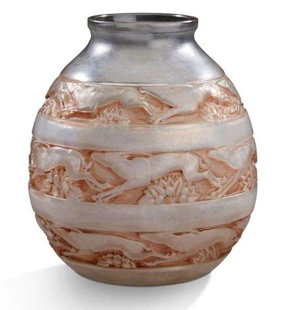 Vase modèle "Soudan" en verre moulé pressé patiné et légèrement irisé.