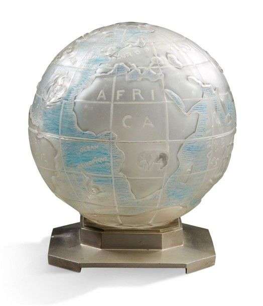 Lampe globe en verre moulé pressé en léger relief reposant dans une structure en bronze nickelé.
