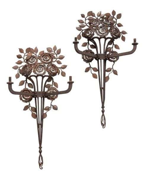 Paire d'appliques en fer forgé patiné à deux bras de lumières à décor ajouré de motifs floraux stylisés.