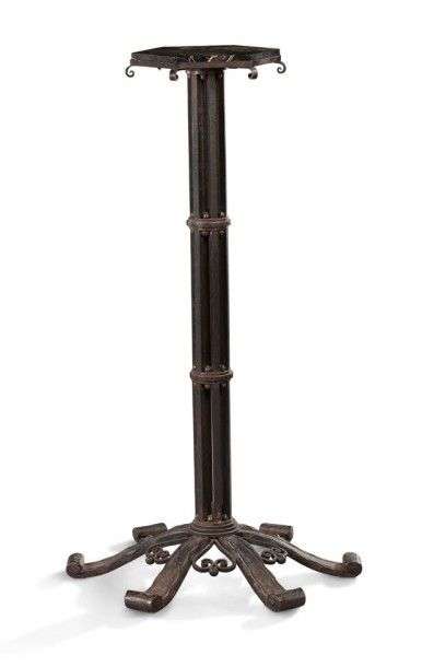 Sellette en fer forgé composé d'un fût ajouré bagué terminé par six pieds à enroulement.