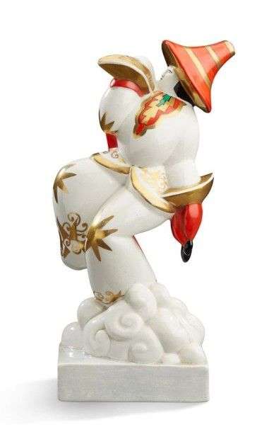 Modèle de Sujet en faïence émaillée blanche, rouge, vert et or figurant un danseur.