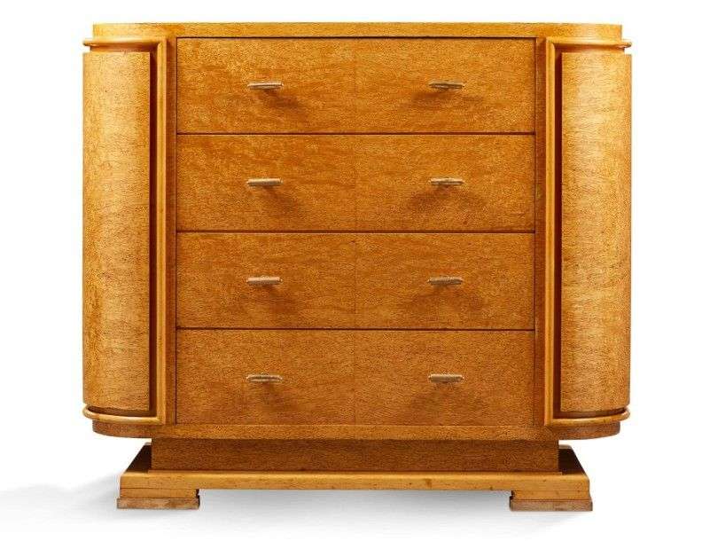 Meuble à hauteur d'appui à corps arrondi en placage de loupe de bouleau et merisier ouvrant en façade par quatre tiroirs à poignées de tirage tubulaires en laiton doré et terminés par des patins quadrangulaires débordants.