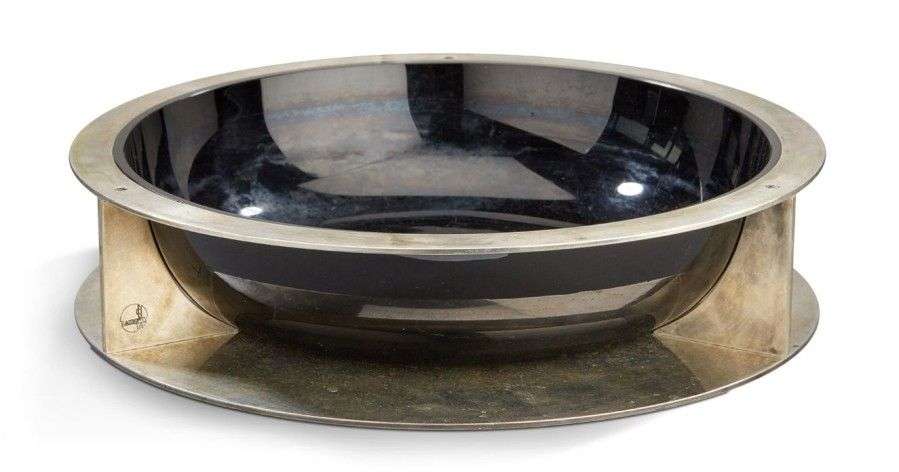 Important vide-poche moderniste circulaire à structure en métal argenté enserrant une coupe en verre teinté noir.