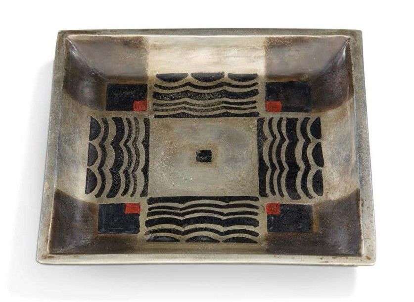 Plateau carré en dinanderie à décor laqué noir et rouge de motifs géométriques.