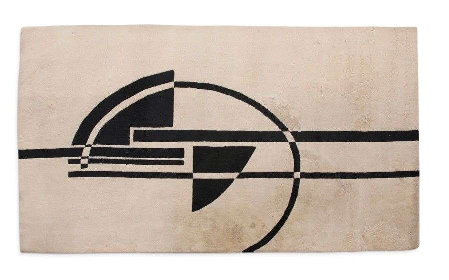 Tapis en laine rase à motifs géométriques noirs dur fond blanc.