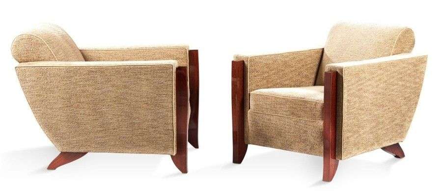 Paire de fauteuils en amarante à dossier droit renversé et accotoirs pleins reposant sur quatre pieds galbés.