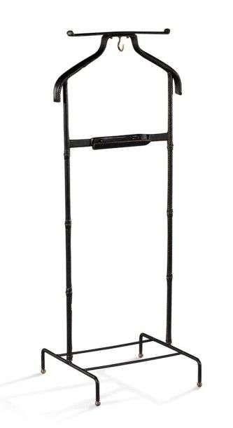 Valet de nuit à armature en métal laqué noir partiellement gainé de cuir noir à piqûre sellier souligné d'éléments en laiton doré.
