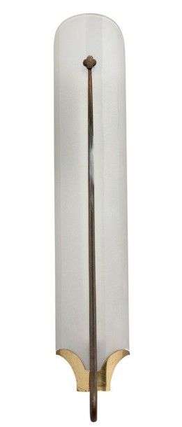 Paire d'appliques en laiton doré et patiné enserrant un verre sablé courbé.