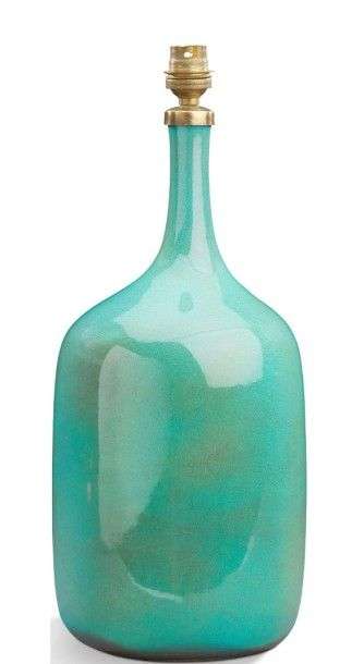 Grande lampe en faïence émaillée bleu nuancé vert à corps tubulaire et long col droit décentré.