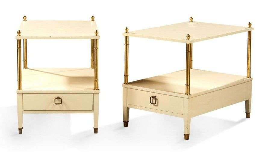 Paire de bouts de canapé laqué crème à montants en laiton doré bagués ouvrant par un tiroir et reposant sur des pieds gaines.