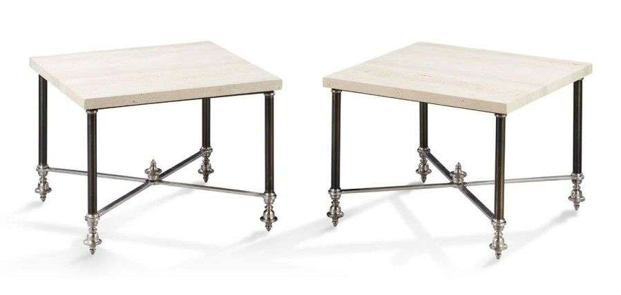 Paire de bouts de canapé à plateau carré en travertin reposant sur un piétement tubulaire en métal à patine canon de fusil reliés par une entretoise en métal chromé.