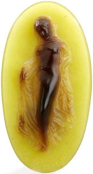 Bas-relief en pâte de verre jaune et ambre figurant une femme drapée.