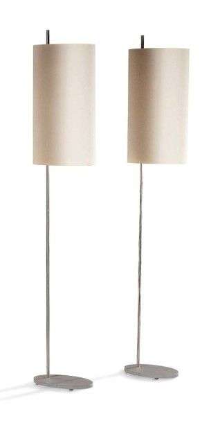Paire de lampadaires modèle "AJ Royal" à fût tubulaire chromé reposant sur une base ovale en acier laqué gris.