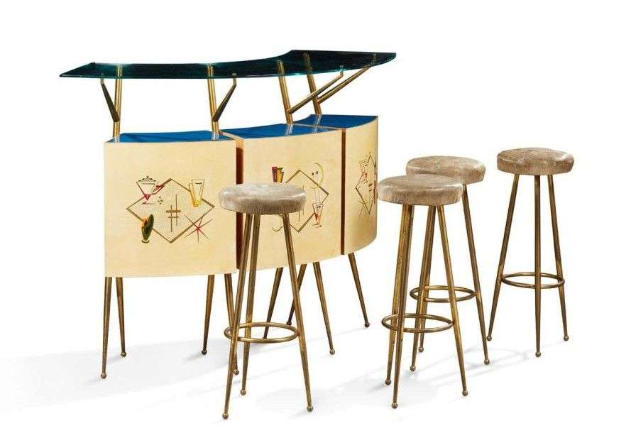 Ensemble de mobilier en placage de merisier à armature en tubes de laiton doré fuselés terminés par des sphères comprenant une étagère à pieds à niche ouverte et plaque de verre bleu et d'un bar de forme arquée garni de parchemin à décor polychrome de motifs géométriques, à plateau en verre translucide et en verre bleu.
