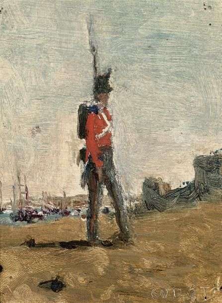 La petite huile sur papier intitulée Un soldat anglais a pu être réalisée au cours de l'un des voyages du peintre. Le sujet, rapidement brossé, indique que l'oeuvre a très probablement été réalisée sur le motif. La facture est grossière mais néanmoins expressive.