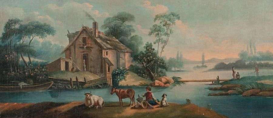 Jeune pêcheurs et son chien près de la ferme