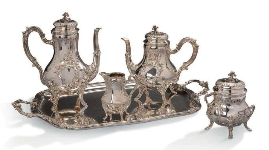 Service à thé et café en argent à décor rocaille comprenant cinq pièces dont une théière, une cafetière, un pot à lait, un sucrier couvert et un plateau à anses.