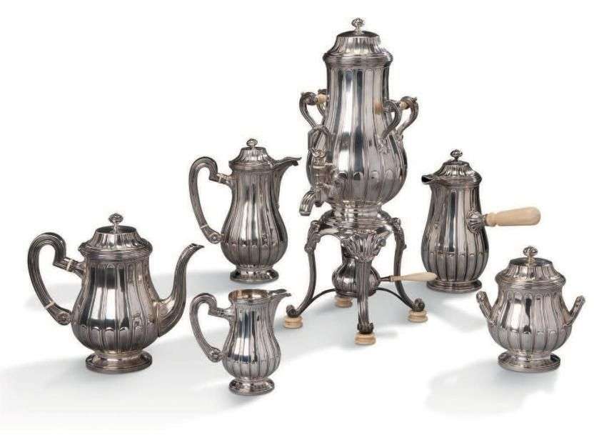 Important service en argent à décor de cannelures et godrons comprenant une thèière, une cafetière, un sucrier couvert, un pot à lait, une chocolatière et un un samovar.