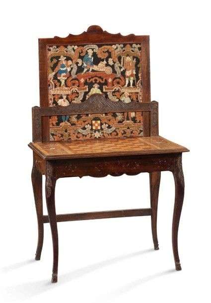 Table à jeux de forme rectangulaire, à écran, en noyer mouluré et sculpté à décor de feuilles d'acanthes sur fond de croisillons.