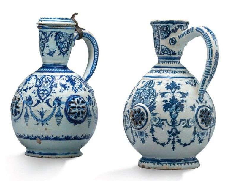 Deux pichets trompeur en faïence à décor en camaieu bleu de lambrequins