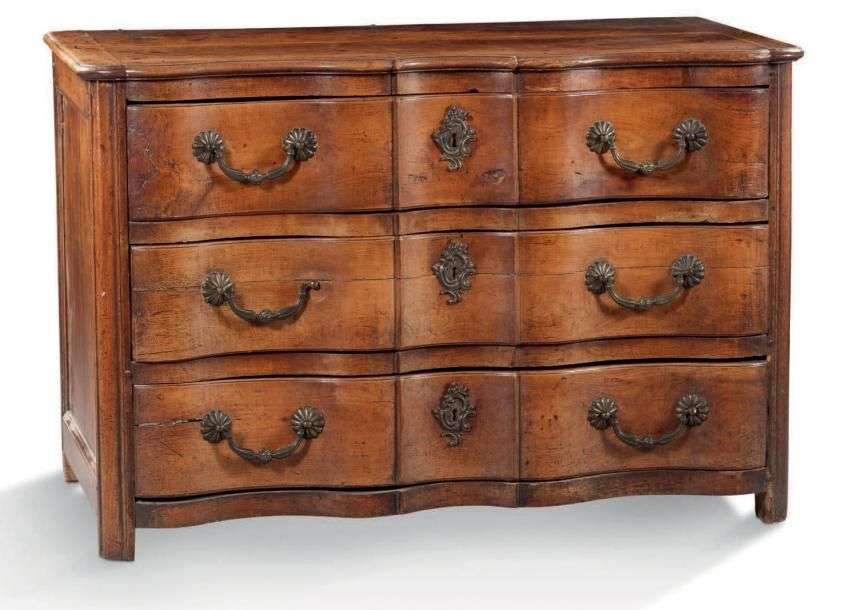 Commode à façade en arbalète en noyer mouluré, elle ouvre par trois rangs