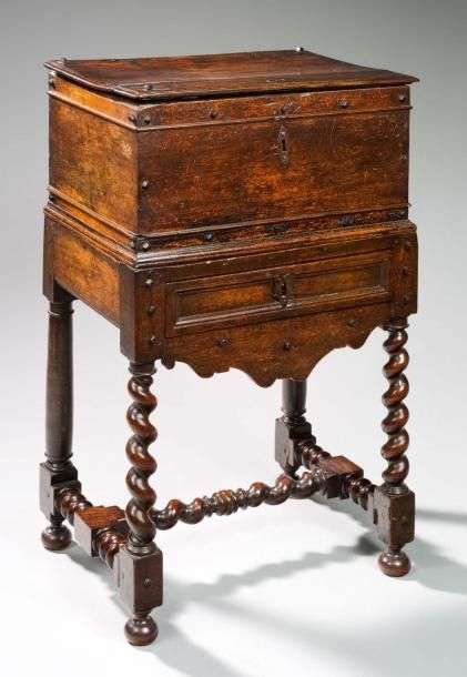 Petit coffre de mariage sur piètement XVIIe. Le coffret repose sur une petite table à piètement torsadé et à colonne à l'arrière.