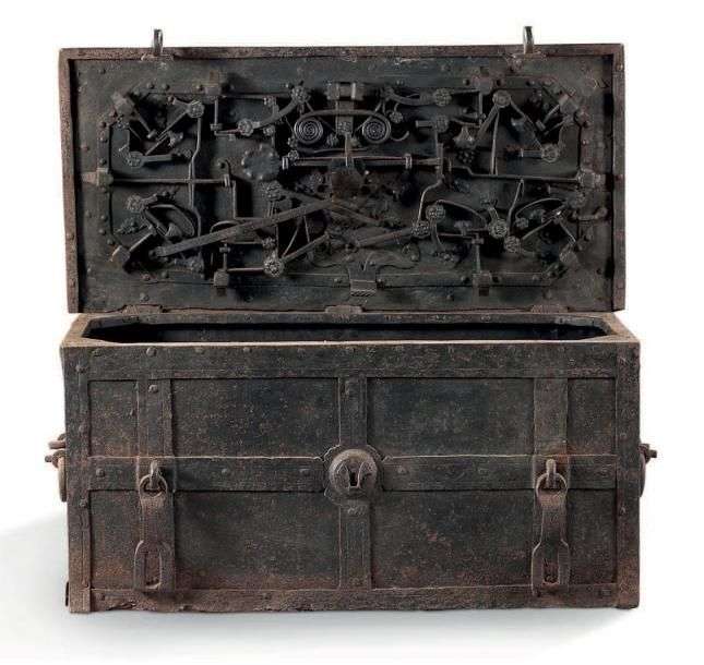 Grand coffre de trésorier dit de corsaire en fer forgé renforcé et bardé. Le plateau découvrant un beau mécanisme ouvragé à dix pênes et clé centrale.
