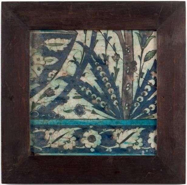 Carreau en céramique siliceuse à décor peint de palmes, arbustes et frises
