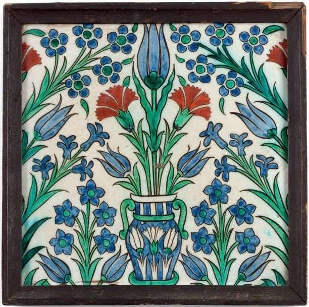 Carreau en céramique siliceuse à décor peint au bouquet de tulipes et oeillets