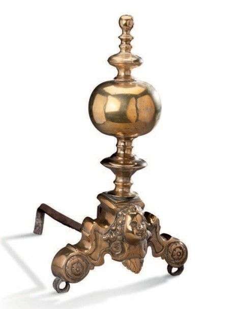 Paire de chênets dits «aux marmousets» en laiton et fer forgé| constitué d'un chevalet porte bûches sur lequel est assembé un fût en disques, encadrant une boule centrale. Le poli du laiton servait de reflecteur à la lumière.