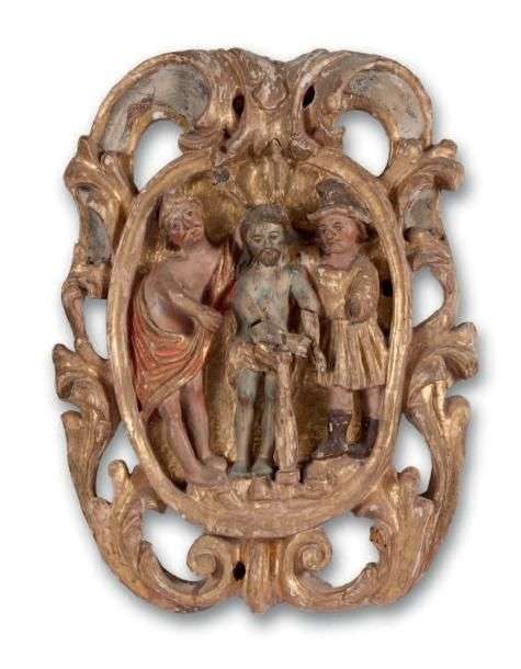 Bas relief en bois sculpté et doré, le médaillon central représentant le Christ à la colonne, traité en polychromie.