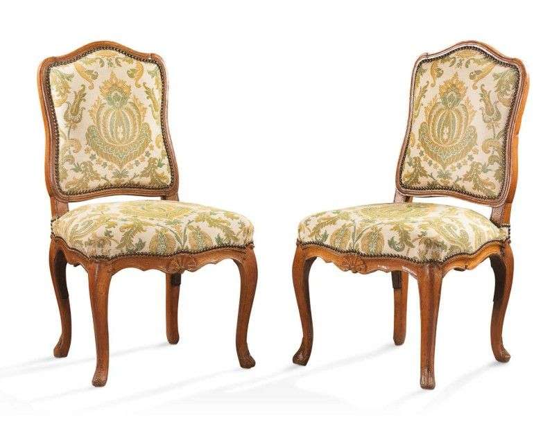 Paire de chaises à dos plat, en bois naturel mouluré et sculpté
