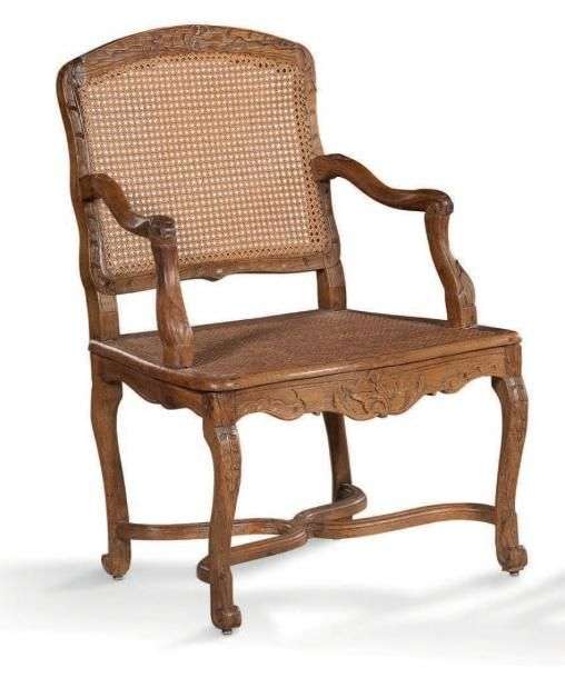 Large fauteuil à dossier à la reine en hêtre mouluré et sculpté à décor de rinceaux feuillagés, de cartouches à volutes. Accotoirs galbés, supports d'accotoirs en retrait, pieds cambrés à enroulements relié par une entretoise en X.