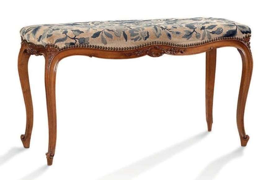 Petite banquette en noyer reposant sur quatre pieds mouvementé, sculpté de guirlandes fleuries.