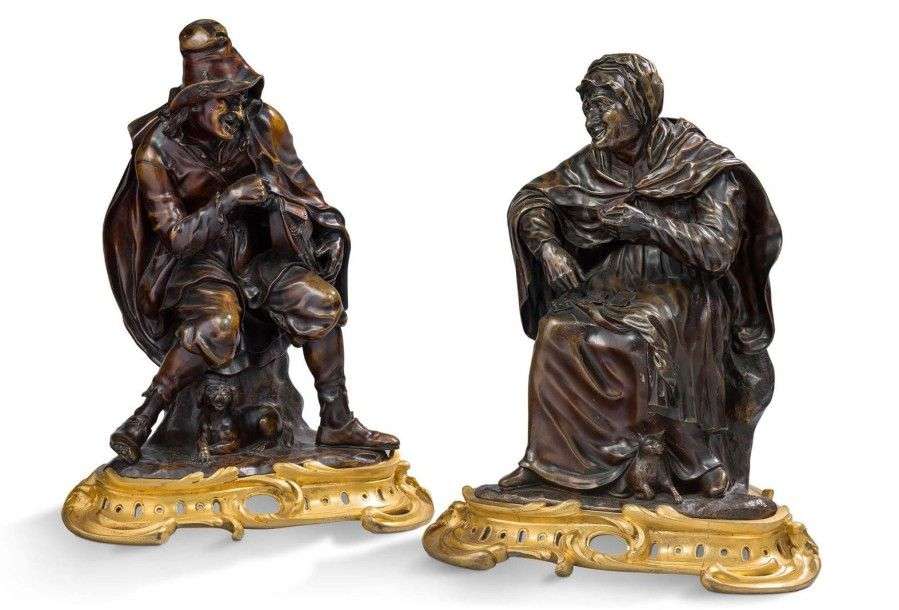 Paire de groupes en bronze patiné et doré représentant une cartomancienne et un joueur de vielle à roue.