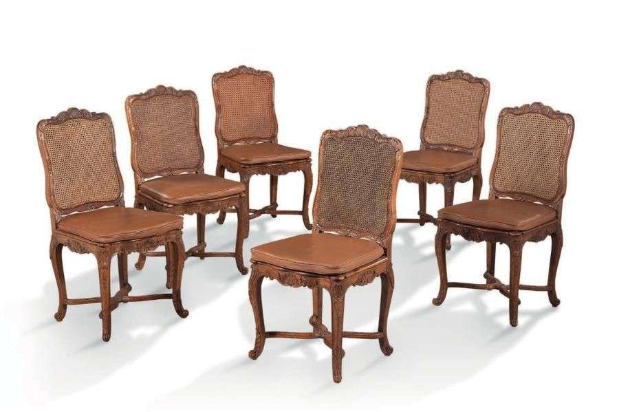Suite de six chaises cannées à haut dossier en bois sculpté à décor de coquilles, palmettes, feuillages et fleurettes.