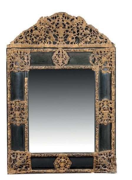 Important miroir à fronton décor de laiton repoussé sur fond de bois noirc