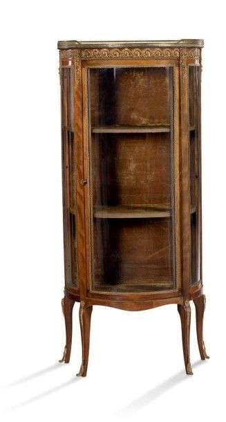 Vitrine en acajou de forme demi-lune ouvrant par une porte vitrée reposant sur quatre galbés.
