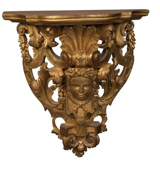 Console d'applique en bois ajouré, sculpté et doré, à décor de mascaron, coquille, enroulements et acanthes.