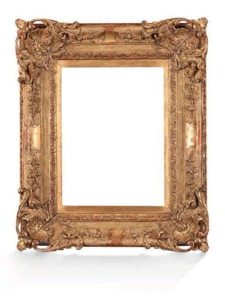 Petit cadre rectangulaire en bois sculpté et doré à riche décor de coquilles dans les angles, d'où s'échappe des rinceaux de feuillages ajourés.