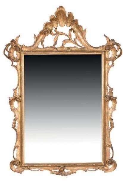 Miroir en bois sculpté et doré à décor ajouré mouvementé de coquilles et volutes à enroulements.